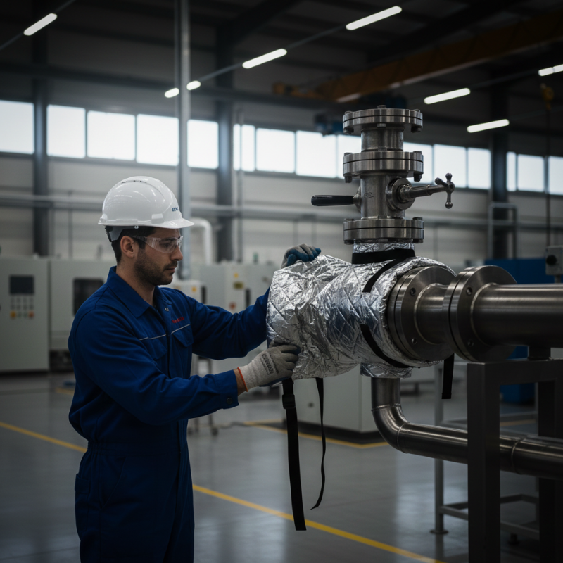 El núcleo de la solución de Thermatron reside en el Diseño y Fabricación de Chaquetas de Aislamiento Textil Desmontable. A diferencia de los aislamientos rígidos tradicionales, estas chaquetas se diseñan y confeccionan meticulosamente a medida para cada componente industrial (válvulas, bridas, codos o cuerpos de extrusoras), garantizando un ajuste perfecto. La naturaleza textil y desmontable de estos sistemas asegura que el personal de mantenimiento pueda acceder al equipo de forma rápida y sencilla para inspecciones o reparaciones sin dañar el aislamiento, lo que minimiza los tiempos de inactividad. Fabricadas con materiales de alta resistencia térmica, estas chaquetas no solo detienen la pérdida de energía y mejoran la seguridad laboral, sino que también ofrecen una solución durable, flexible y reutilizable, optimizando la vida útil de los sistemas de aislamiento.