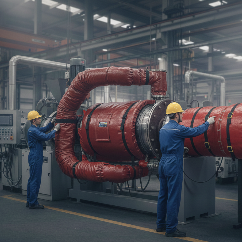 La solución Thermatron para extrusoras industriales se basa en un doble sistema: chaqueta aislante + funda de protección, diseñado específicamente para cubrir el cuerpo y componentes críticos del equipo. Las chaquetas se adaptan a la geometría real de la extrusora (cilindro, tornillo, conexiones, soportes, válvulas, etc.), asegurando un ajuste perfecto y un aislamiento continuo, mientras que la funda de protección protege frente a polvo, residuos y agentes externos. Se seleccionan tejidos y materiales según la temperatura de trabajo y el entorno operativo, garantizando resistencia, durabilidad y facilidad de mantenimiento, sin comprometer el acceso para inspecciones o ajustes.